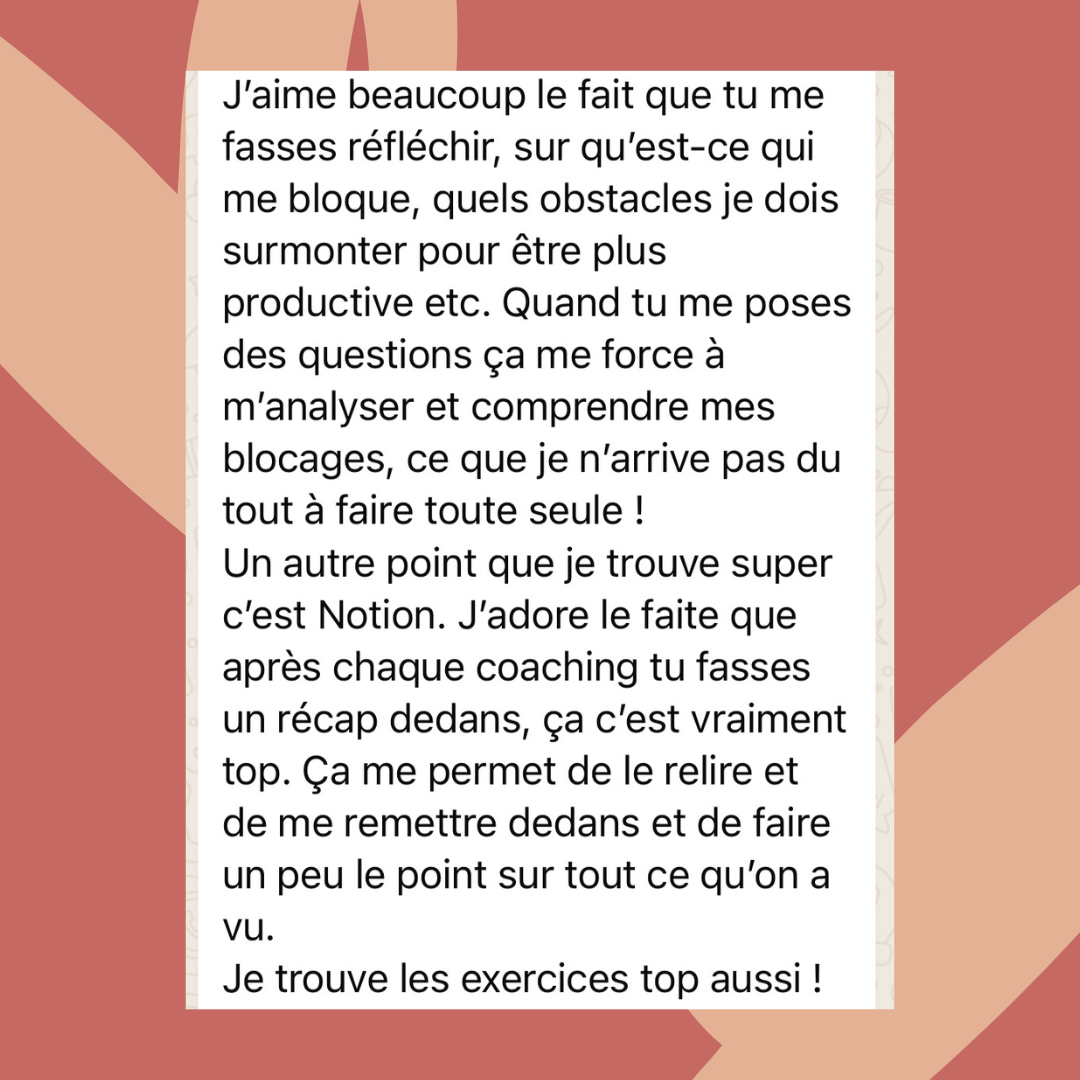 Je ne peux pas te dire quels résultats tu auras car ça dépendra de toi et du travail qu'on fera. Mais je te promets que ta productivité sera améliorée, que tu arriveras à avancer dans tes objectifs et que tu seras beaucoup plus épanouie dans ta vie.